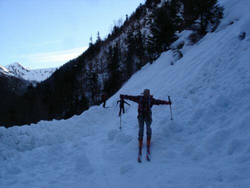 Claude sortant d'une des nombreuses avalanches barrant la route Bious Artigues